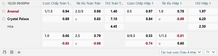 Bảng tỷ lệ kèo nhà cái Arsenal vs Crystal Palace