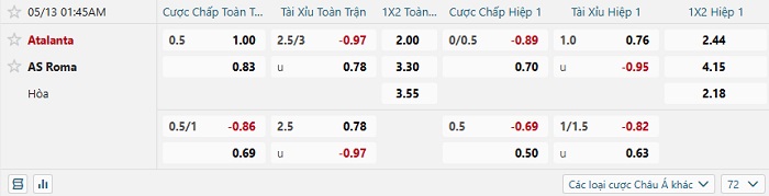 Bảng tỷ lệ kèo nhà cái Atalanta vs Roma