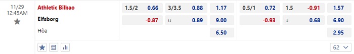 Bảng tỷ lệ kèo bóng đá Athletic Bilbao vs Elfsborg