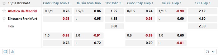 Bảng tỷ lệ kèo bóng đá Atletico Madrid vs Ein.Frankfurt