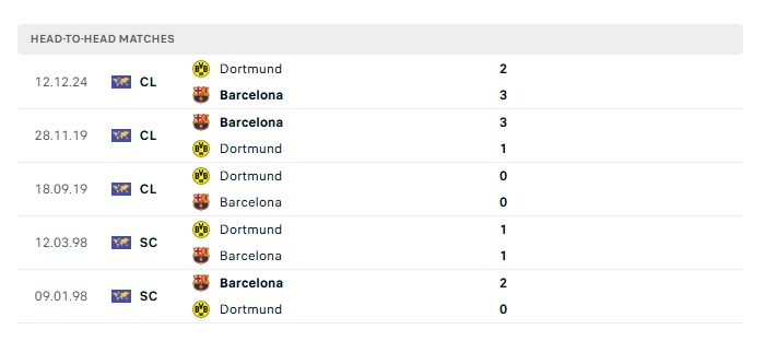 - Kèo tỷ số H2 Barcelona vs Dortmund: 4-1