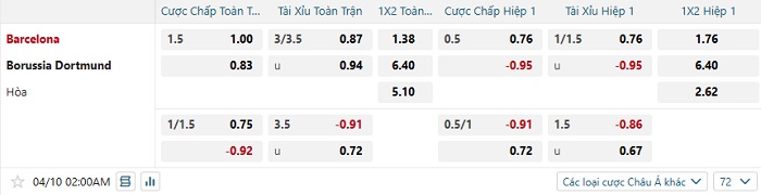Bảng tỷ lệ kèo bóng đá Barcelona vs Dortmund