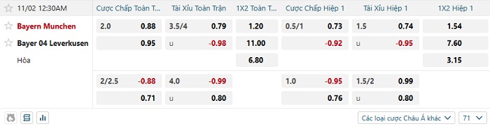 Bảng tỷ lệ kèo bóng đá Bayern Munich vs Bayer Leverkusen