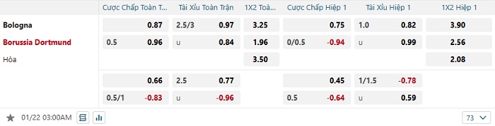 Bảng tỷ lệ kèo bóng đá Bologna vs Dortmund