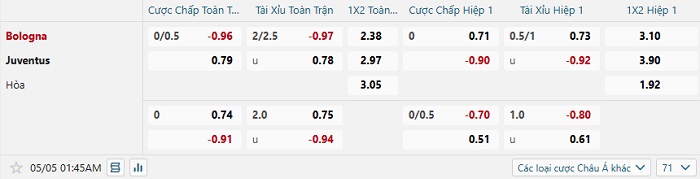 Hiện tại, Bologna đang nhận mức chấp -1/4 từ nhà cái và khả năng thắng kèo của họ không quá cao. Trong 4 trận đấu gần nhất của đội chủ nhà, họ được ghi nhận đã có đến 3 thất bại và chỉ thắng 1. Ngoài ra thì 9 lần gần nhất Juventus đến làm khách tại sân của Bologna, họ đã thắng kèo 8, thua 1. Do đó, kèo châu Á trận đấu hôm nay sẽ có đội khách là lựa chọn an toàn nhất trong cả 2 hiệp.