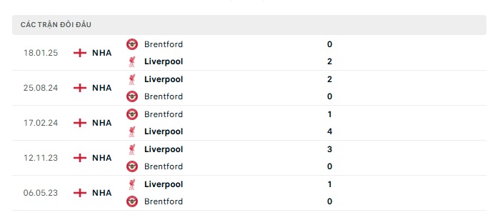 Lịch sử đối đầu Brentford vs Liverpool