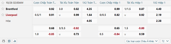 Soi kèo châu Á, kèo Brentford vs Liverpool