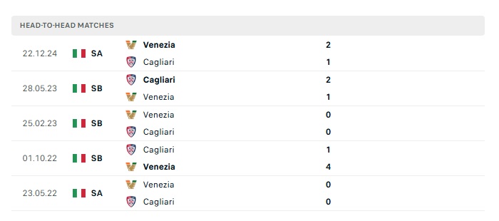 Lịch sử đối đầu Cagliari vs Venezia