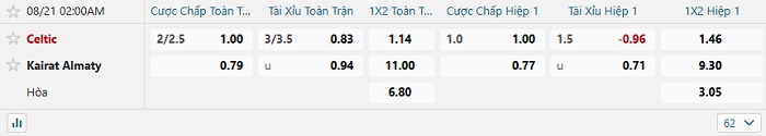 Với hàng loạt những thống kê được đưa ra, các chuyên gia đều khẳng định rằng Celtic sẽ dễ dàng đánh bại đối thủ ở trận đấu này. Trong 6 trận gần nhất tại sân nhà, Celtic được ghi nhận đã bất bại với 5 thắng, 1 hòa. Trong khi đó thì Kairat trong 4 trận sân khách gần nhất, họ chỉ thắng 1, hòa 1 và thua 2. Do đó, kèo châu Âu trận đấu hôm nay sẽ có Celtic là lựa chọn an toàn nhất trong cả 2 hiệp.