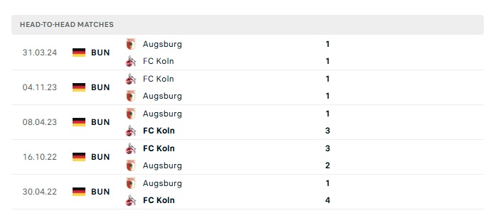 - Kèo tỷ số H2 FC Koln vs Augsburg: 2-1