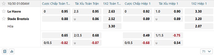 Bảng tỷ lệ kèo bóng đá Le Havre vs Stade Brestois