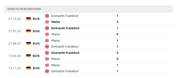 Lịch sử đối đầu Mainz vs Ein.Frankfurt