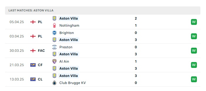 - Phong độ gần đây Aston Villa