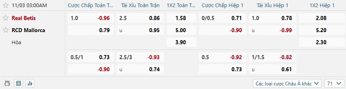 Bảng tỷ lệ kèo bóng đá Real Betis vs Mallorca