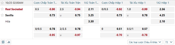 Bảng tỷ lệ kèo bóng đá Real Sociedad vs Sevilla