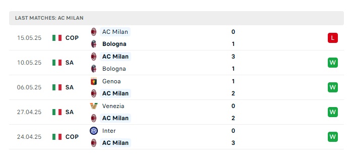 - Phong độ gần đây AC Milan