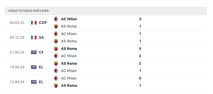 Lịch sử đối đầu Roma vs AC Milan