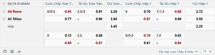 Bảng tỷ lệ kèo nhà cái Roma vs AC Milan