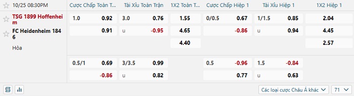 Tip kèo Châu Á hiệp 1 Hoffenheim vs Heidenheim