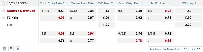 Tip kèo Châu Á hiệp 1 Dortmund vs Koln