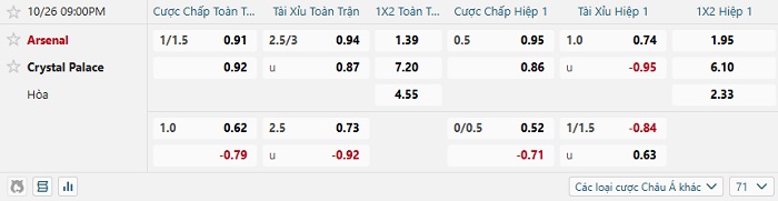 Tip kèo Châu Á hiệp 1 Arsenal vs Crystal Palace