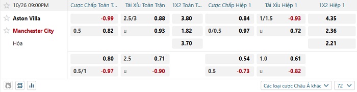 Tip kèo Châu Á hiệp 1 Aston Villa vs Man City