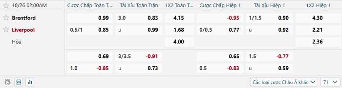 Tip kèo Châu Á hiệp 1 Brentford vs Liverpool