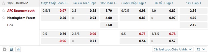 Tip kèo Châu Á hiệp 1 Bournemouth vs Nottingham